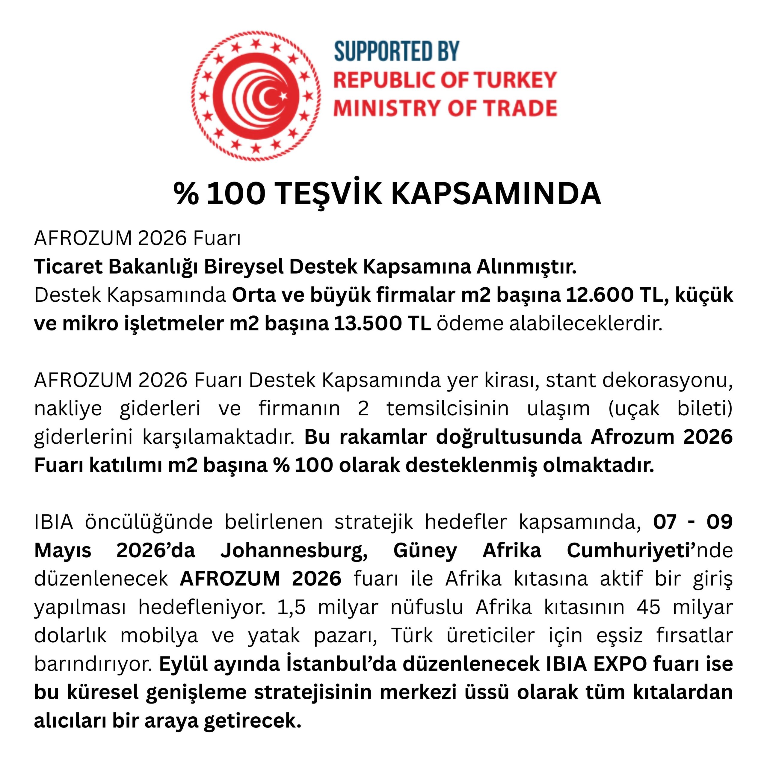 Güney Afrika, dünya çapında ticaret yapmak isteyen Türk firmaları için stratejik bir üs konumundadır. Güney Afrika’ya ihracat yapan firmalar, yalnızca Afrika pazarlarıyla sınırlı kalmaz, aynı zamanda Avrupa, Orta Doğu ve Asya pazarlarına da kolayca erişim sağlayabilir. Lojistik avantajlar, ticaret anlaşmaları, güçlü bölgesel bağlantılar ve global ticaret ağı sayesinde, Güney Afrika, Türk firmalarının dünyaya açılması için önemli bir basamaktır. Tüm avantajları eşsiz bir ticarete çevirecek olan AFROZUM Fuarı , 07- 09 Mayıs 2026 tarihleri arasında Johannesburg -Güney Afrika Cumhuriyeti‘nde gerçekleştirilecek.